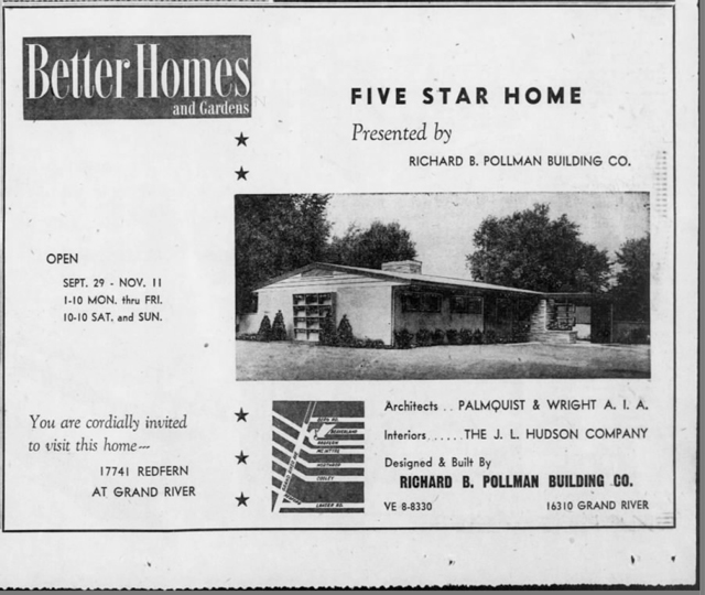 The firm of Irving E. Palmquist and Clifford N. Wright specialized in functional, stylish residential designs. It is understood they worked extensively with designer/builder Richard B. Pollman. It was Pollman who promoted Palmquist & Wright as the chosen architects for the homes he built and sold – this included numerous advertisements such as the one below (from the Detroit Free Press, September 1951). Many of the ads highlighted the Richard B. Pollman Building Company as having over 400 designs (created by Palmquist & Wright) for his clients to select from that would then be custom built to suit their every need. Another advertisement in 1955 promoted Home No. 449, a convenient split-level home.