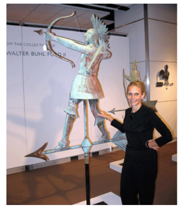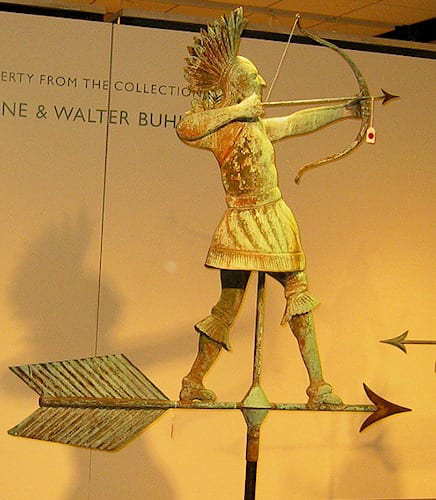 It was reported “the weathervane represents the best of the Nineteenth Century mentality about the nobility of the Native American. As a sculpture, the figure has perfect expression, proportion and patina,” said New York dealer Sy Rappaport, an advisor to the Lauren’s. Source: www.antiquesandthearts.com. It is acknowledged by Sotheby’s specialist Nancy Druckman the piece was probably a special commission for a fraternal lodge or community institution. “It’s a masterpiece in every respect; remarkable for its size, condition and artistry,” noted the head of Sotheby’s American folk-art department, describing the auction as one of the most exciting events of her 30-plus-year career at the New York-based auction house. Image courtesy of:antiquesandthearts.com